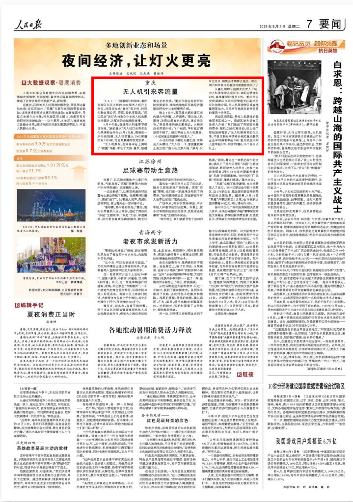 在重庆,江畔的无人机展演扮靓夜空,带旺周边餐饮住宿;在江苏徐州,“苏超”元素与夜间消费紧密联动,让球迷得到更多实惠和更优体验;在青海西宁,马路在夜间化为市集,特色街区用主题IP、光影秀等打造别样的夜游体验……这个夏天,各地深入推动商旅文体融合发展,通过夜间经济激发暑期消费活力、丰富人民群众生活。
