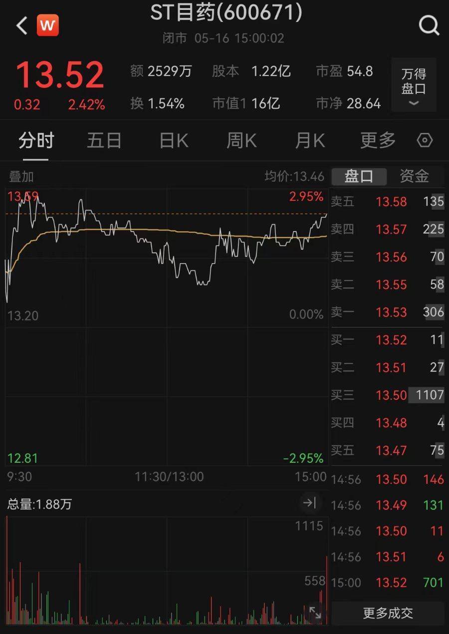 二级市场方面,年初至今,ST目药股价累计涨幅达53.98%,截至5月16日收盘,ST目药报收13.52元/股,日内涨幅2.42%。