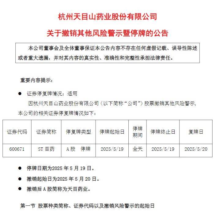5月16日,ST目药发布公告称,公司股票将于5月19日停牌一天,5月20日起复牌并撤销其他风险警示,撤销风险警示后,公司股票转出风险警示板交易,公司股票价格的日涨跌幅限制由5%变更为10%。同时,公司股票简称由“ST目药”变更为“天目药业”。