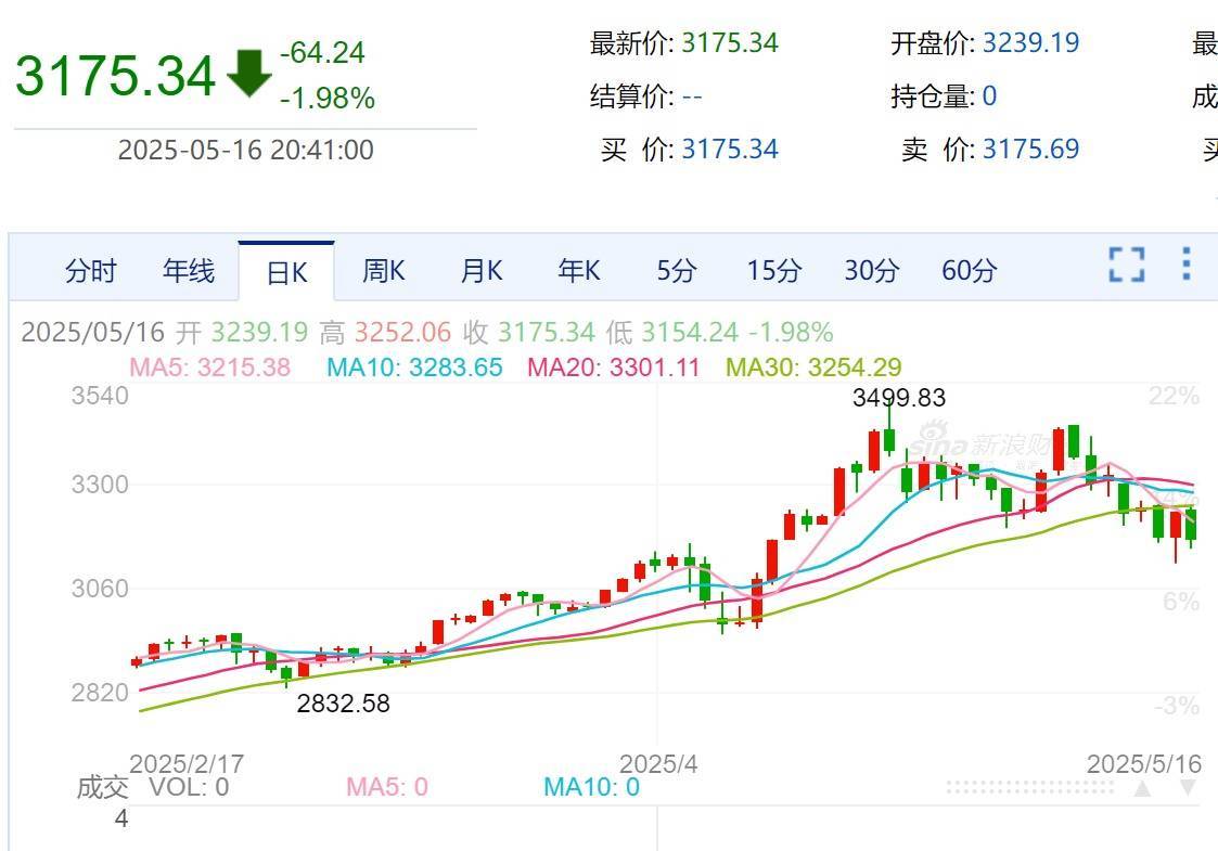 5月14日,伦敦现货黄金价格下跌超过2%,跌破3200美元关口,创下近五周新低。5月15日,跌势进一步延续,伦敦现货黄金最低触及3120美元/盎司。今日盘中再次跌超2%配资炒股入门,自高点3499美元/盎司以来,最高下跌幅度接近10%。